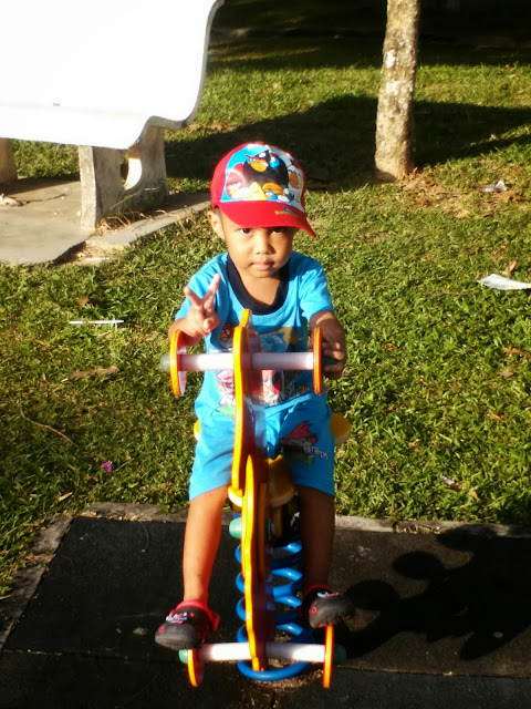 Tiba waktu Asar, kami bergilir solat kerana menjaga Aleef. Melihat waktu sudah hampir 6 petang dan cuaca yang baik, kami buat keputusan membawa anak-anak ke taman. Waktu yang paling ditunggu anak-anak. Tengok saja gambar-gambar yang saya selitkan. Sampai 2 buah taman permainan kami pergi. Yang pertama tu, banyak nyamuk aedes. Bahaya betul. Jadi, kami pergi ke taman yang lebih baik dan baru dibina. Walaupun jauh sedikit, ia lebih baik berbanding mendapat sakit denggi. Nampak gembira betul anak-anak termasuk si Aleef. Hilang sekejap sakitnya.